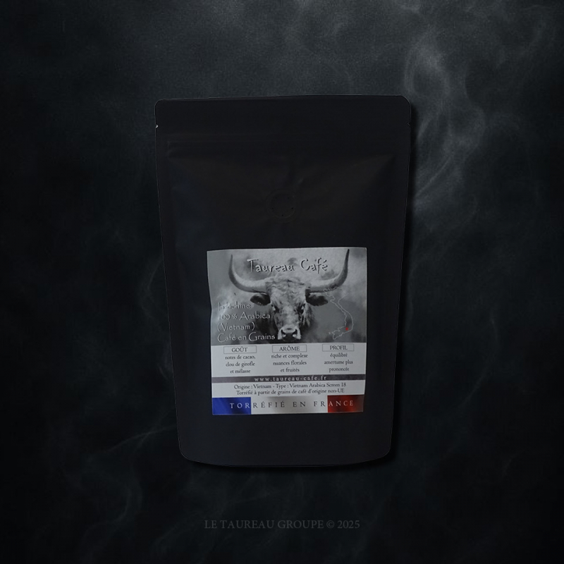 Un café puissant et sophistiqué, cultivé dans les hauteurs brumeuses de Da Lat. Cet Arabica vietnamien (Screen 18) dévoile une belle complexité : des notes profondes de cacao, de clou de girofle et de mélasse s’équilibrent avec une amertume affirmée.